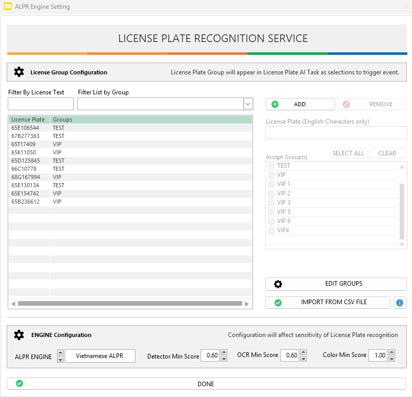 button to start creating and managing groups (e.g., Employees, Visitors, Blacklisted, VIP) - After creating groups, you can now assign the license plates to one or more groups.