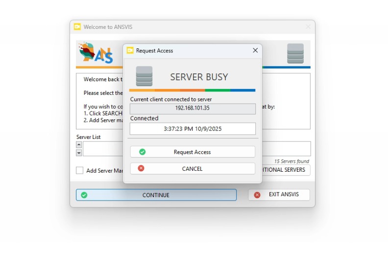 If the server is already in use, a Request Access dialog will appear. When you press Request, the current user will be notified and can either approve or reject your request. If the user does not respond after 60 seconds, your ANSVIS Client will automatically gain access.